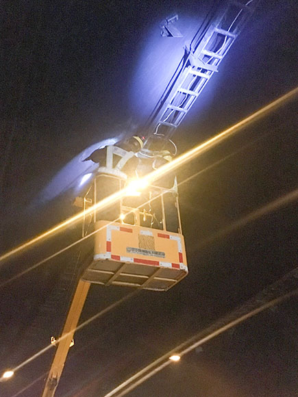 中午11:00,因流量過大,高速交警要求臨時開放被堵主車道。趁此空隙機會,中心隊伍暫撤到黃土嶺隧道管理所解決午餐,之后又馬不停蹄奔赴并集結在北洞口緊急停車帶,待重新封道后繼續跟進作業,力爭在審批時間內做更多的維修。考慮到主車道燈具損壞不多,抽調一組登高車人員負責攝像頭檢修工作,而底下人員則負責修復更換消防、緊急電話等標志燈,每組人員都在與時間賽跑,忙的顧不上喝水。