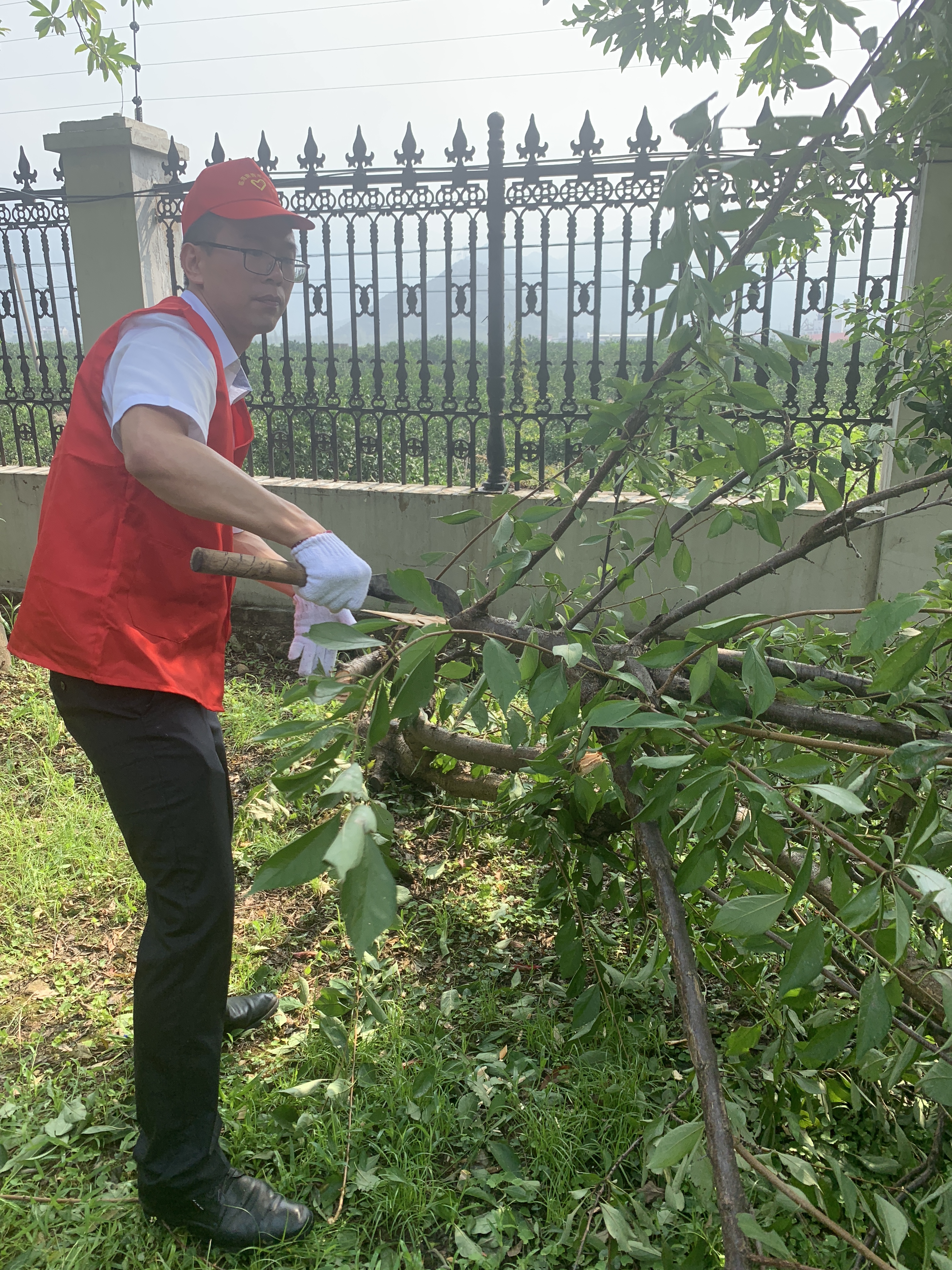 圖為志愿者合影 8月13日上午,該所志愿服務(wù)隊身穿統(tǒng)一紅色馬甲,積極投身到災(zāi)后恢復(fù)工作中。 “把砍刀給我,我力氣大,讓我來?!?/span> 活動過程中,孫明偉、杜廣勝、楊堅等同志一行先查看了配電房周邊綠化帶,看到有樹木倒伏,壓在防護網(wǎng)上,存在較大安全隱患,他們二話不說立即手拿砍刀,對樹木進行切割處理,并由李學平、包德福等人安排拉車將斷木等清理干凈。