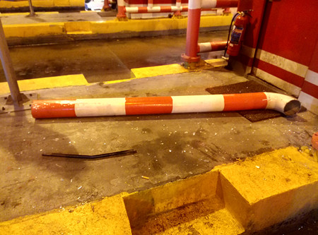 圖為被撞壞的收費崗亭 該車在臺州收費站下高速時,由于車身太長,司機沒察覺到車后半部分所載的傾斜的大米,出收費站時也沒有留意觀看后視鏡,導致傾斜的大米直接把五號收費亭防撞鋼管和收費亭邊窗玻璃撞壞,發出巨大響聲。收費班長陳幸聞聲后立刻跑到崗亭察看,五號車道右前方的防撞欄被撞斷,右側玻璃破碎,五號崗亭內工作臺上、地面上全是玻璃碎渣,所幸當時崗亭內無人在崗,沒有造成人員受傷。 陳幸一邊通知負責路產勘察賠償的人員到場,一邊協助司機先將傾斜的幾包貨物卸下,再將車移到外廣場,以免堵住車道,影響四號車道正常通行。最后經勘察定損,司機按規定賠償了500元。 在此,筆者提醒廣大司機朋友,過收費站時一定要慢行,注意四周的收費設施,并及時檢查所載貨物有無歪斜,既保證自己及他人的安全,也減少不必要的損失。 余娟娟