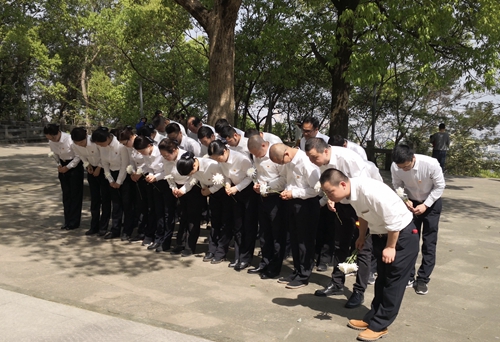 圖為敬獻鮮花 九峰烈士陵園始建于1956年,埋葬著20世紀50年代為國捐軀的120余位革命先烈。墓區(qū)內青松翠柏環(huán)繞,墓前豎有一座“革命烈士永垂不朽”的石碑。上午10時許,祭掃儀式開始,全體人員懷著無比崇敬的心情向革命先烈鞠躬默哀,緊接著依次走到紀念碑前敬獻鮮花,表達對革命先驅的悼念與緬懷之情。在紀念碑前,全體黨員重溫入黨誓詞“我志愿加入中國共產黨,擁護黨的綱領,遵守黨的章程......”