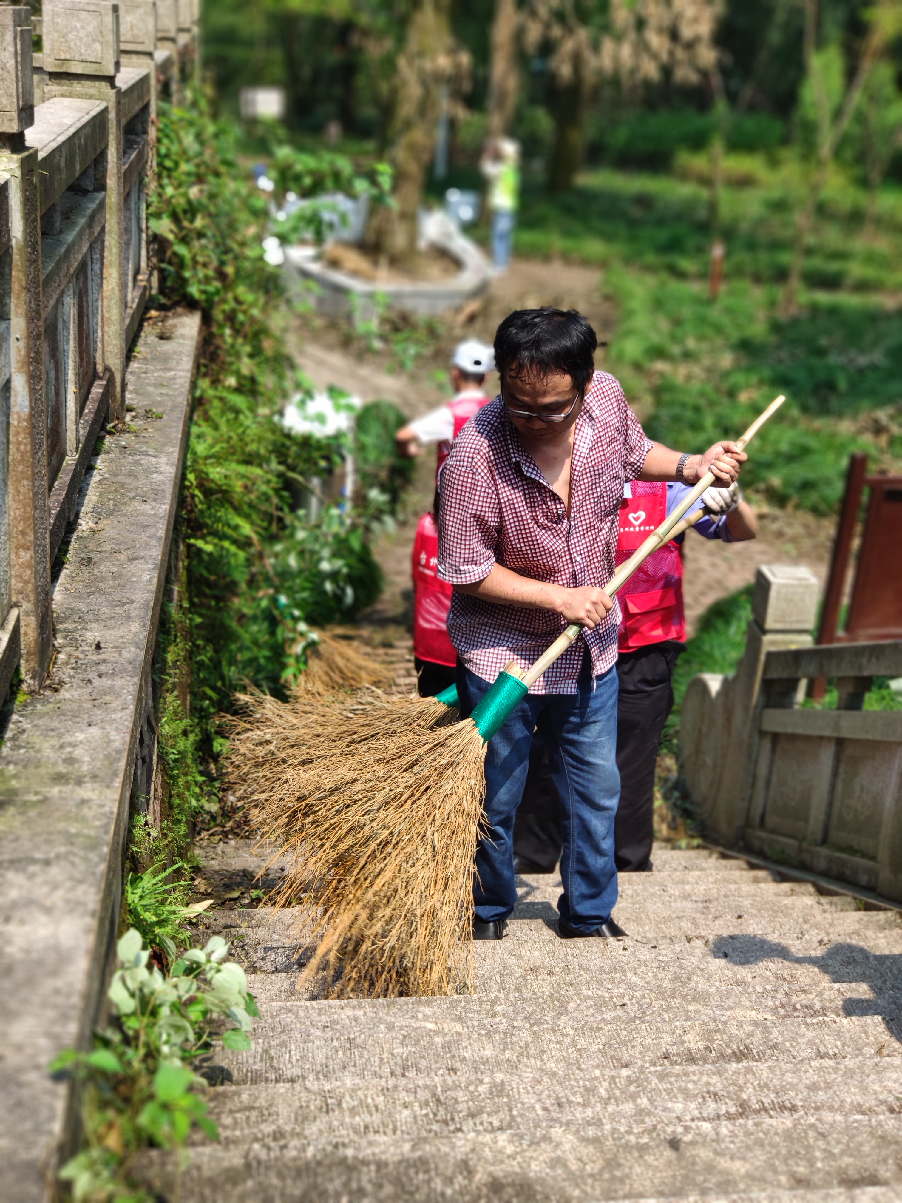圖為打掃現(xiàn)場 上午8點半左右,志愿者們帶著掃把、鐵鍬等工具到達(dá)九峰公園,在黃巖青年志愿者的帶領(lǐng)下,來到劃分的平臺區(qū)塊。受9號臺風(fēng)“利奇馬”影響,公園內(nèi)不少樹木倒地,枯葉遍地。志愿者們帶著手套,用掃把、鐵鍬將平臺區(qū)域內(nèi)堆積的落葉和樹枝進行裝袋清理。小的樹枝用草繩捆扎;拿不動的樹枝,用鋸子鋸斷了抬走;鐵鍬不好裝袋,就用手去捧。烈日酷暑下,志愿者們不顧汗流浹背,經(jīng)過兩個多小時的努力,共清理出40多袋垃圾,大家用雙手還公園一片美。