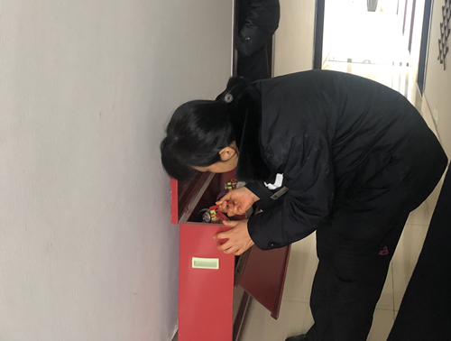 圖為檢查組檢查消防器材 在這之前,溫嶺西收費所排除了一起日常生活中出現的安全隱患。收費二班班長陳軍路過自動伸縮門時,發現該門不銹鋼骨架有一節彎折脫落的現象。若不及時修理,開門時極容易造成電機損壞。于是他立即把情況反應給所領導,考慮到半夜所里仍有車輛進出,他又馬上聯系安全員林葉輝,監控員陳丹軍找來工具和鐵絲,三人齊心協力把脫落的骨架進行了復位鞏固,消除了安全隱患。