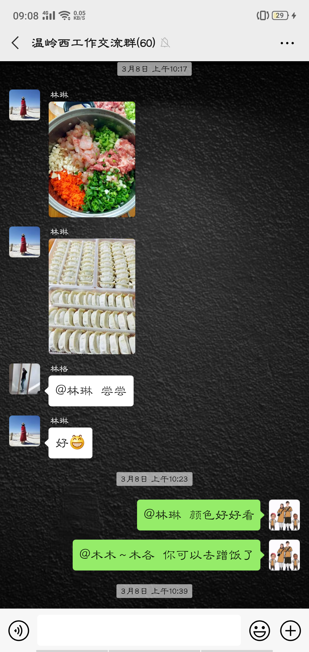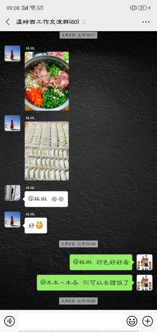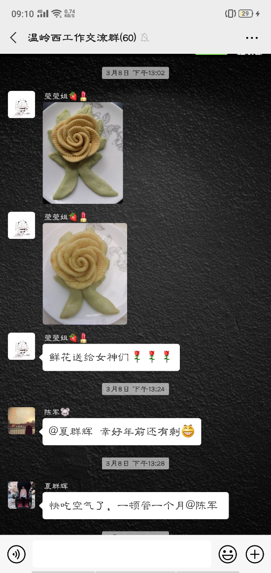 活動(dòng)中,大家的參與性都很高,紛紛在微信群內(nèi)曬出自己制作的美食:鹽焗雞可樂雞翅、蔥油角角魚、溫嶺小吃豬肉飯、玫瑰南瓜饅頭……紛紛亮出了自己的拿手好菜在群里談?wù)摰脽峄鸪斓耐瑫r(shí),也不忘介紹一下自己做的菜甚至很多男同事也紛紛曬出自己的最佳廚藝,祝福女同胞節(jié)日快樂
