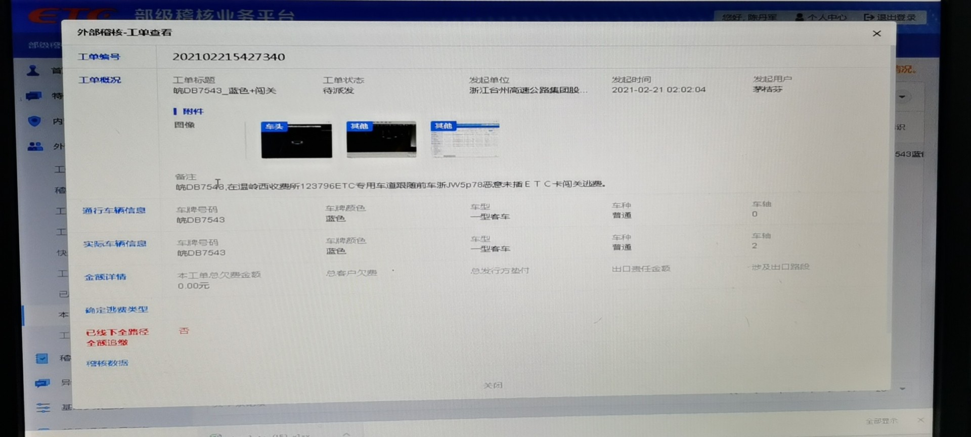 (圖為發(fā)起追繳通行費(fèi)工單)