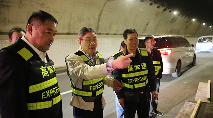 10月31日上午,臺州高速集團董事長陳文波在總工程師江輝的陪同下,趕赴甬臺溫高速公路溫州方向黃土嶺隧道、橋梁維修加固工程施工現(xiàn)場,檢查施工進展情況。