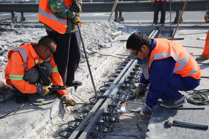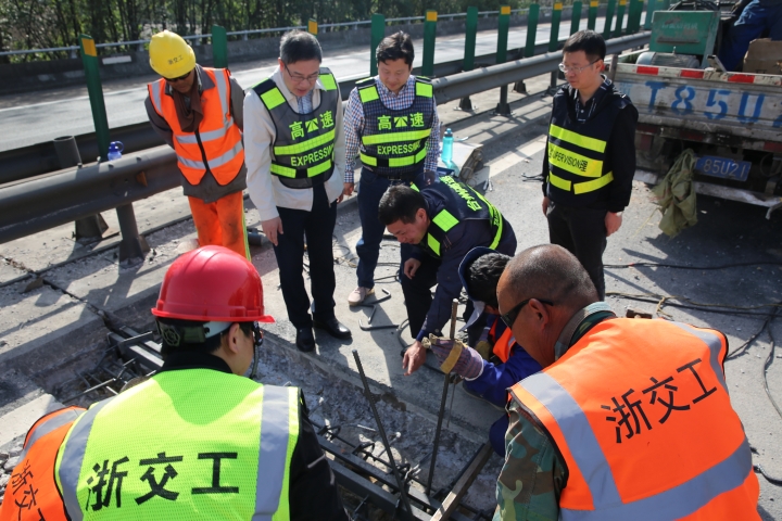 隨后,在伸縮縫型鋼安裝現(xiàn)場,陳文波撿起鑿除的碎渣,查看被鑿除的舊伸縮縫情況。公司所轄路段屬于軟土路基,且有91座橋梁,由于運行時間已20余年,部分橋梁伸縮縫破損較為嚴(yán)重,如何維修橋梁伸縮縫和橋頭跳一直是個老大難問題。在橋梁伸縮縫修補現(xiàn)場,因為重車的碾壓,部分伸縮縫已經(jīng)磨損嚴(yán)重,所在的混凝土路面只能借助鑿巖機進行作業(yè)。
