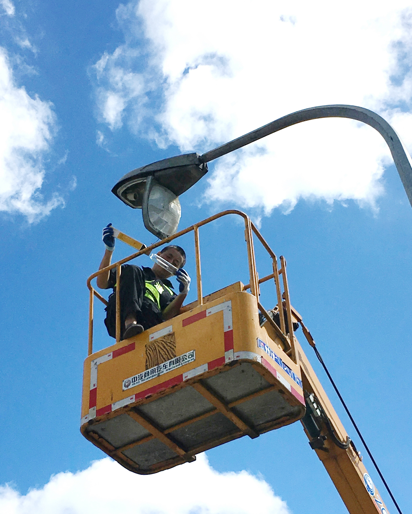 圖為張鵬在登高車上維修廣場路燈